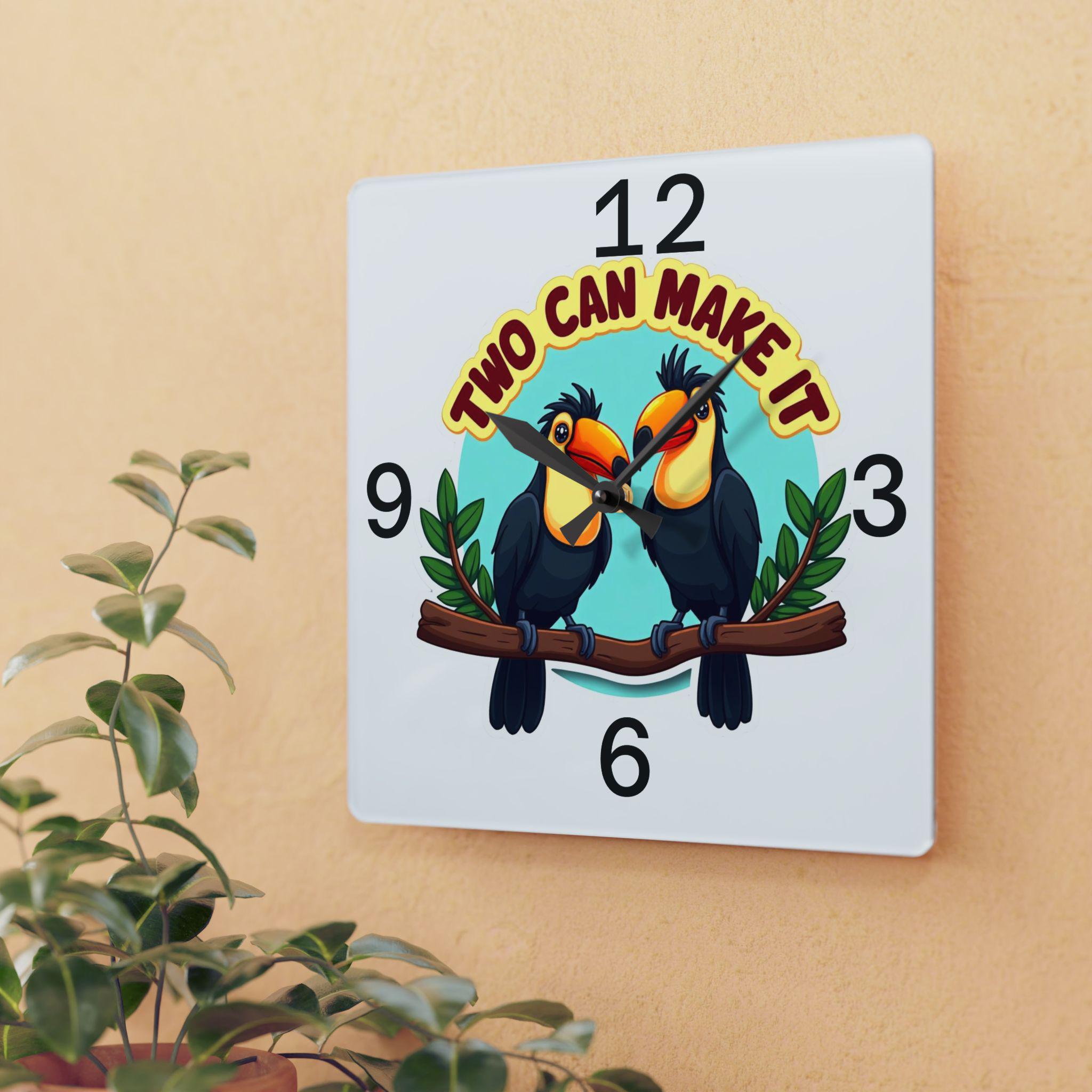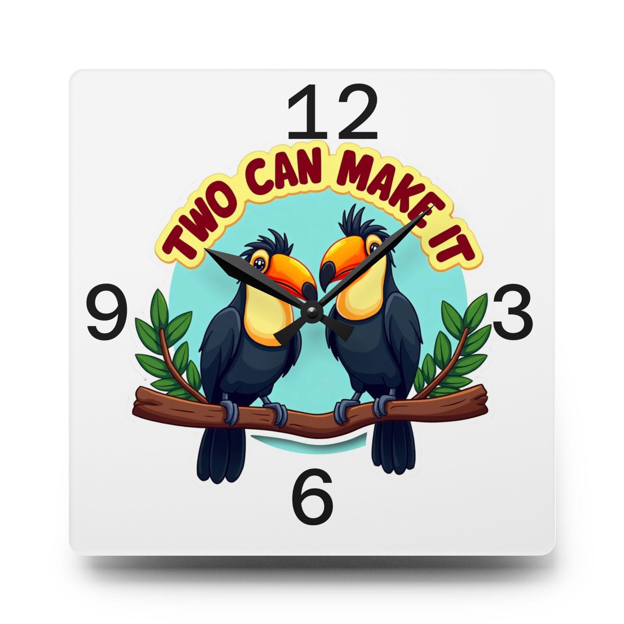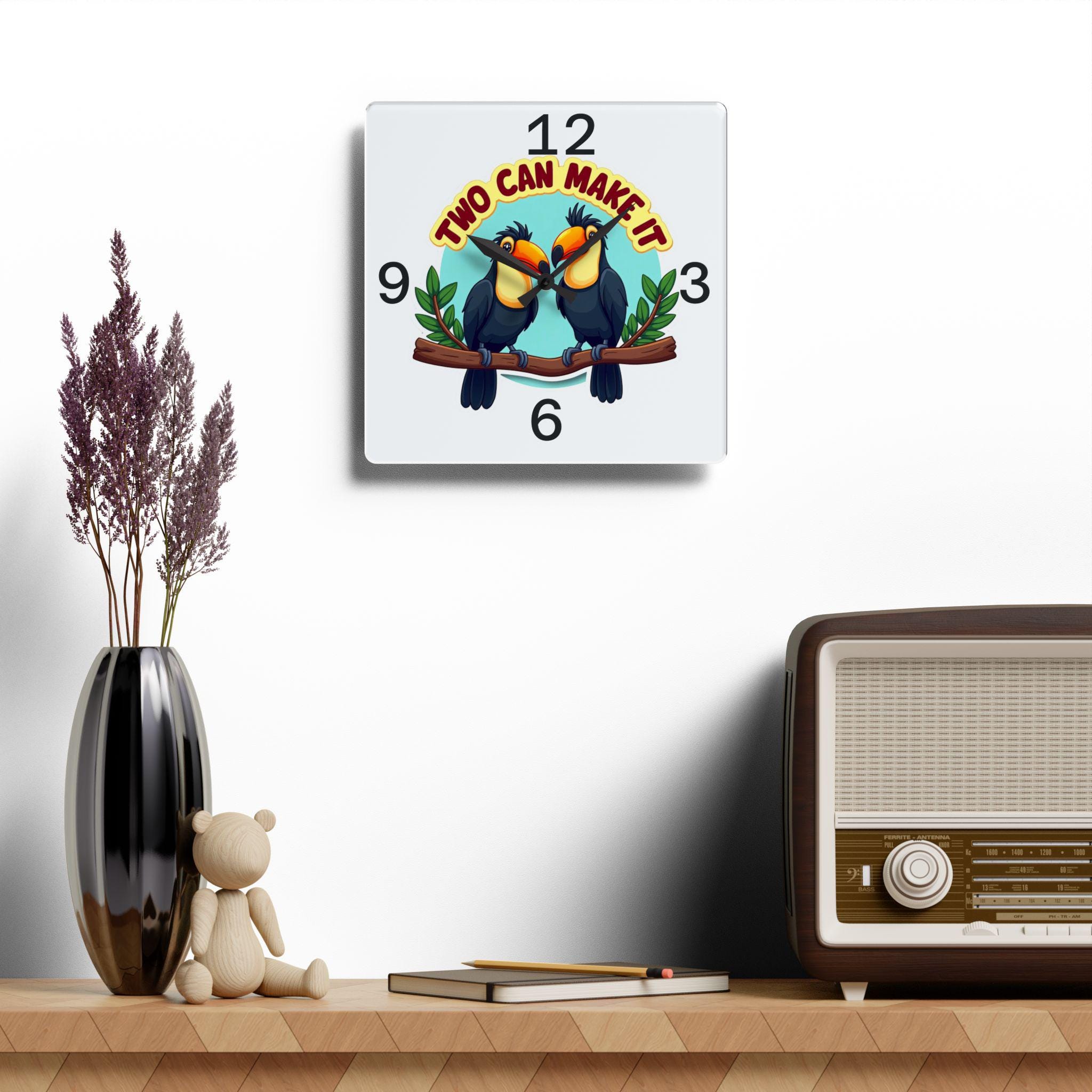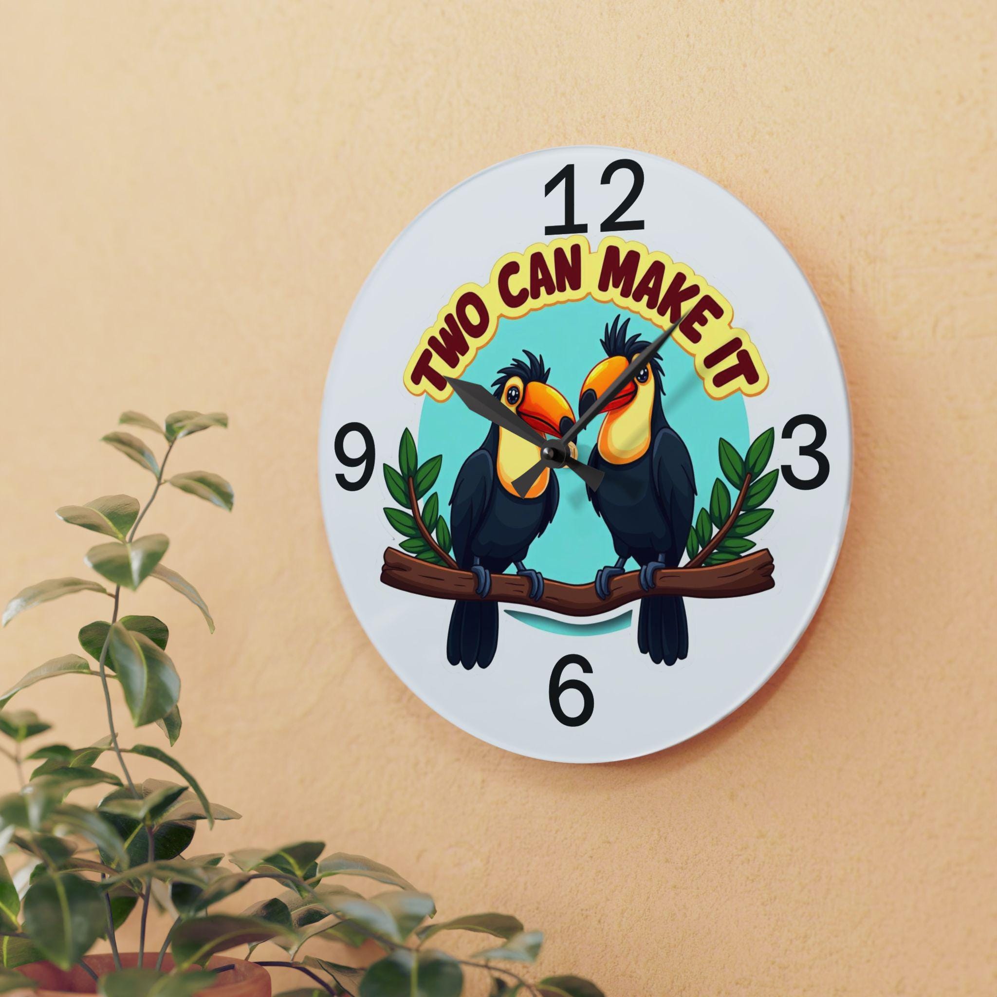 Bring a touch of fun and tropical charm to your home with this 'Two Can Make It' wall clock, featuring two adorable toucans perched on a branch. The playful design, bold colors, and clear numbering make it perfect for a living room, kitchen, nursery, or office. This clock is relevant for tropical-themed decor enthusiasts, bird lovers, and those looking to add a whimsical flair to their space. Ideal for home decor, housewarming gifts, tropical-themed parties, and summer celebrations.