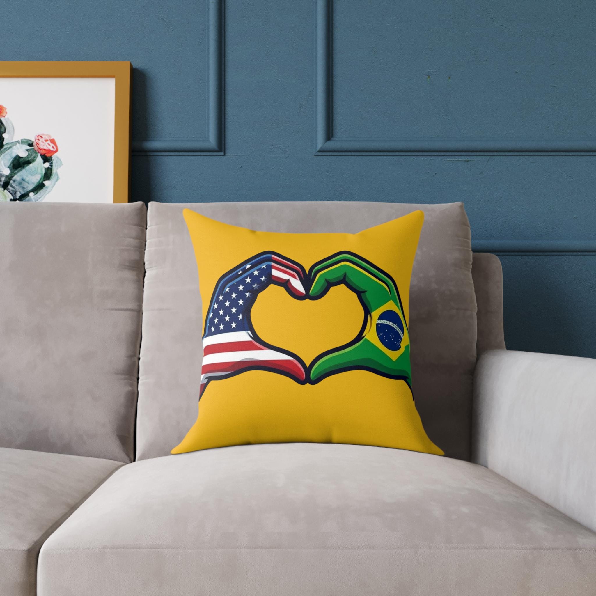 Sunlight, laughter, and two worlds coming together. This square poly canvas pillow shows a tender moment—two hands forming a heart, one wrapped in the American flag and the other in the Brazilian flag—set against a warm yellow field. The bright double-sided print keeps the image vivid from any angle. The fine-weave polyester canvas feels soft under your palm while a resilient polyester fill keeps the pillow plump whether it’s propped on a sofa, tumbled onto the floor for a movie night, or layered on a bed. A hidden zipper preserves the clean lines so the design remains the focal point. Place it where friends gather and stories are shared; it brings playful color and a heartfelt reminder of connection across cultures.