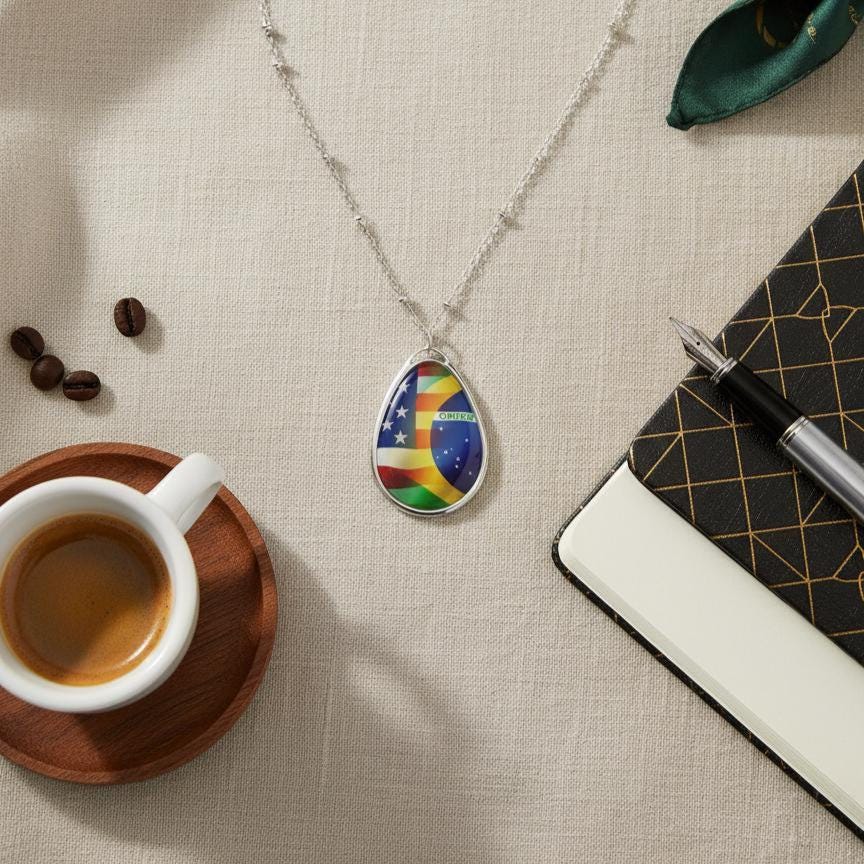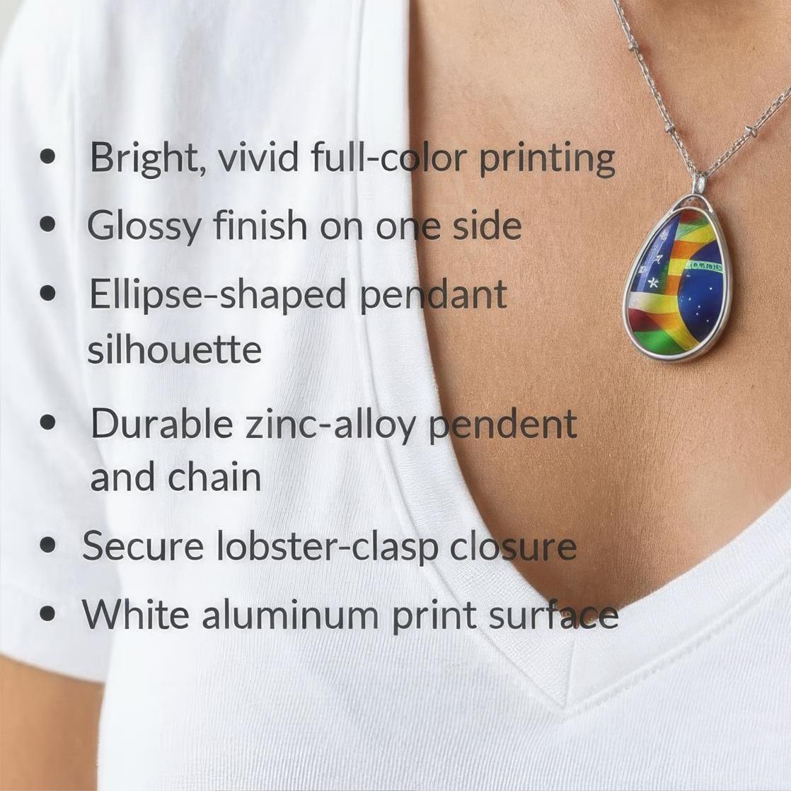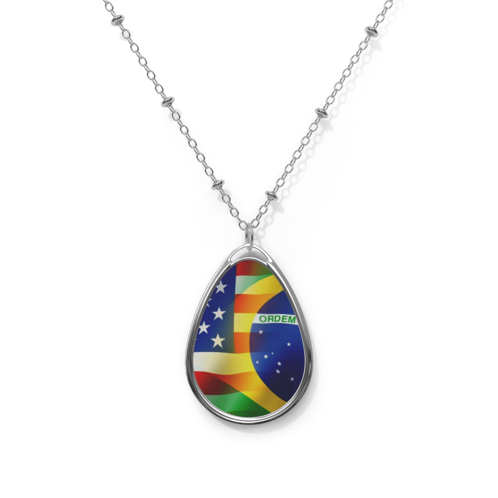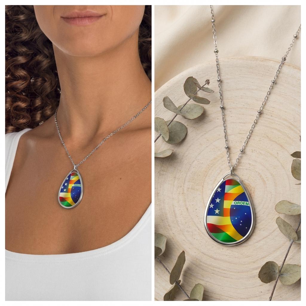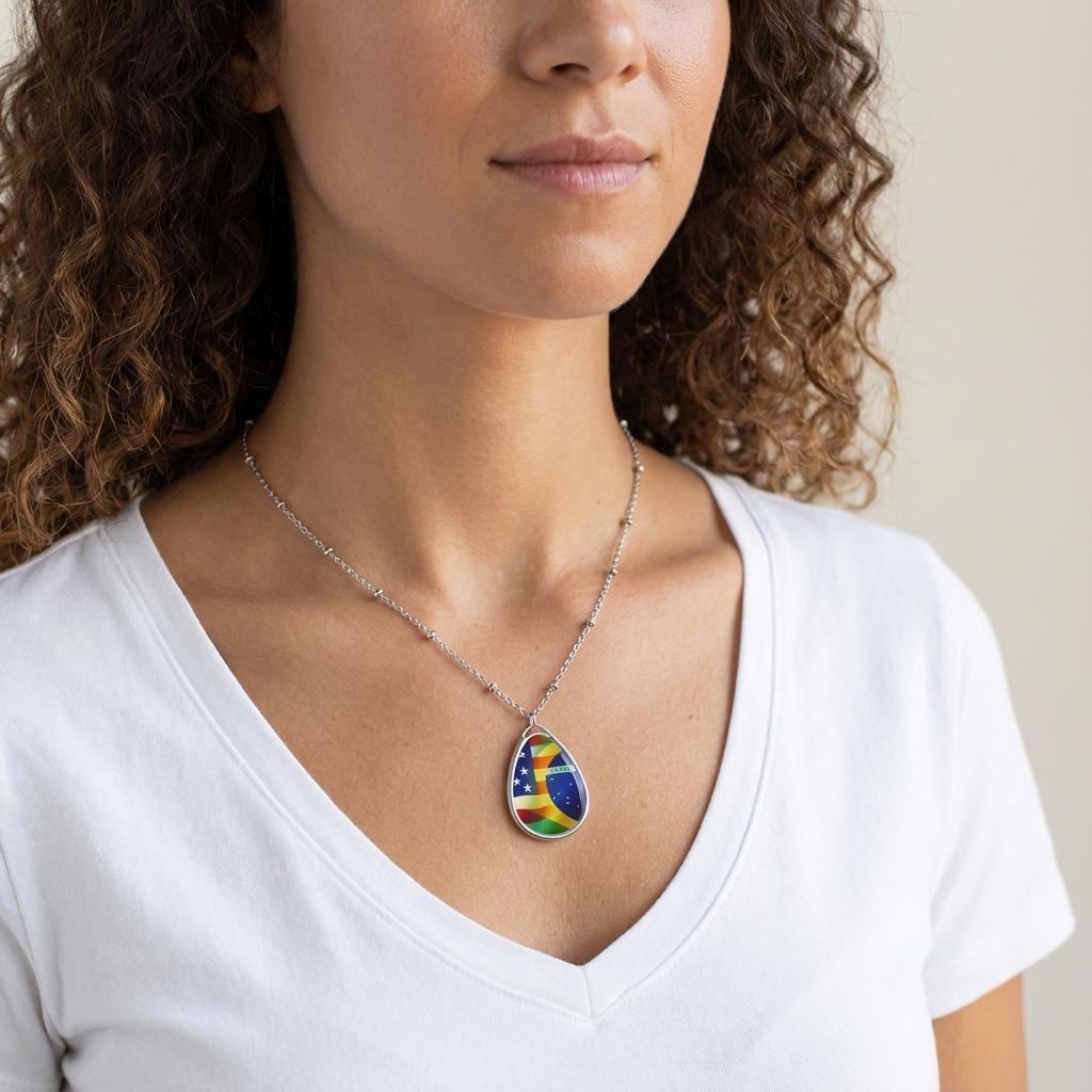 This oval flag pendant necklace rests light against the chest as a small declaration of blended roots and shared journeys. The glossy full color flag graphics, USA merging into Brazil, catch the light and start conversations. It sits close to everyday life, worn on morning coffee runs, at weekend festivals, or tucked beneath a jacket during family gatherings.