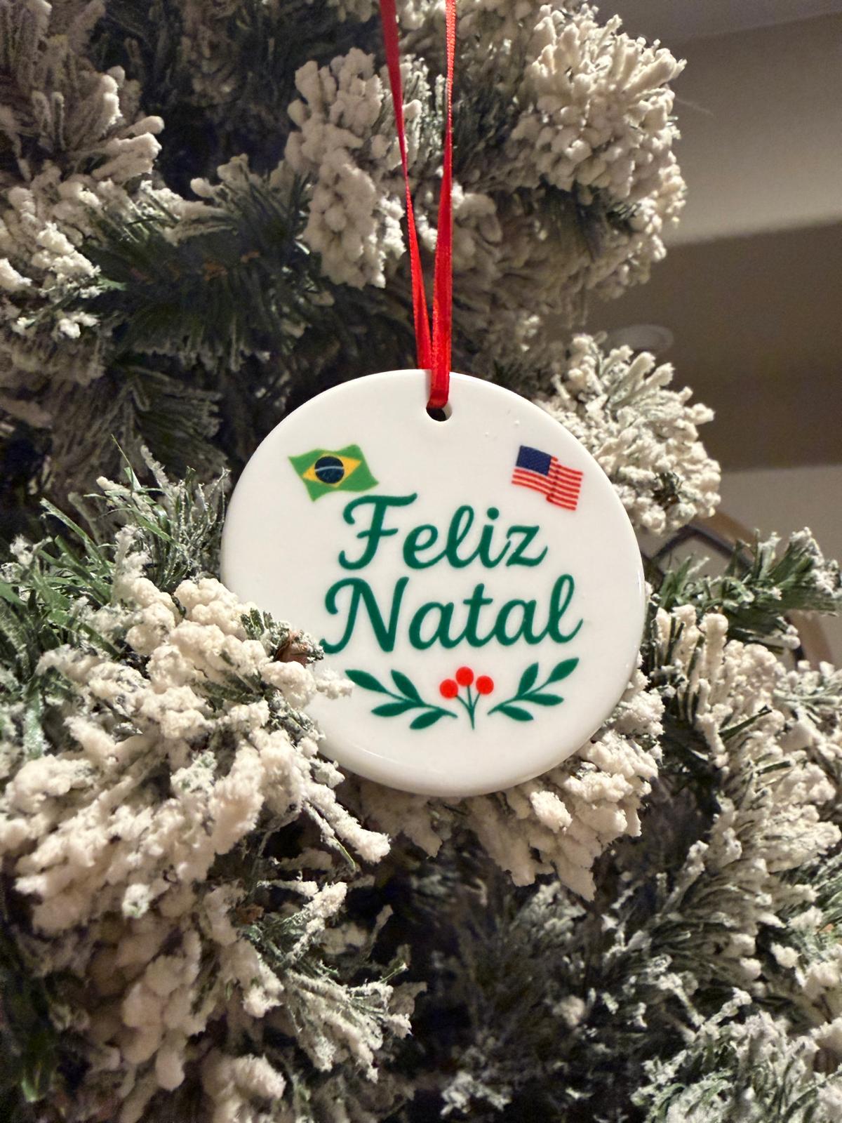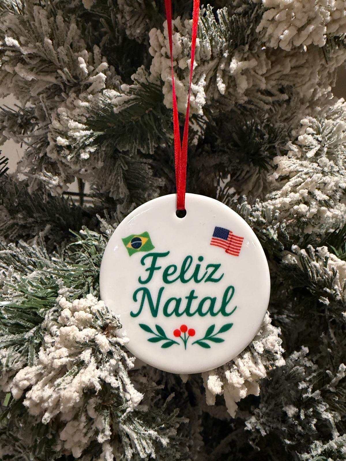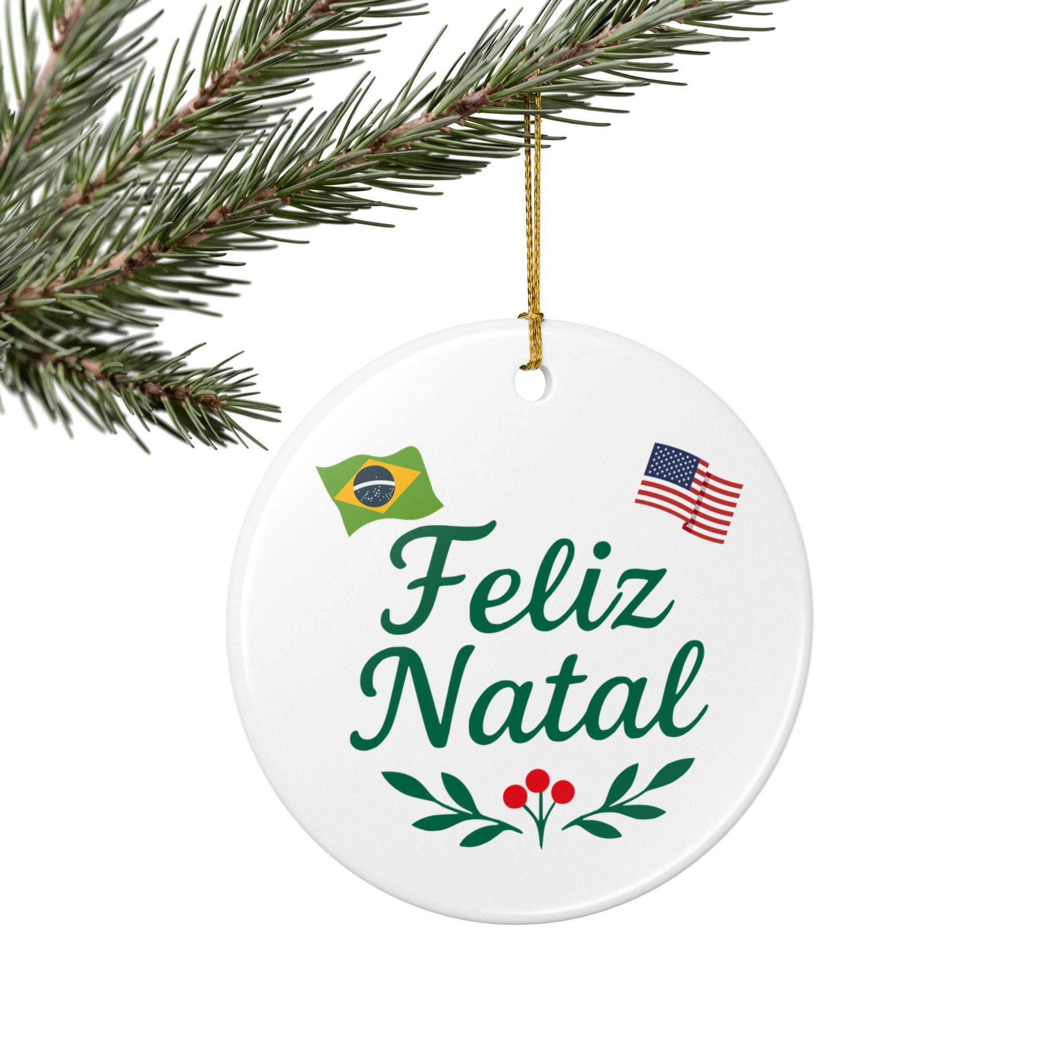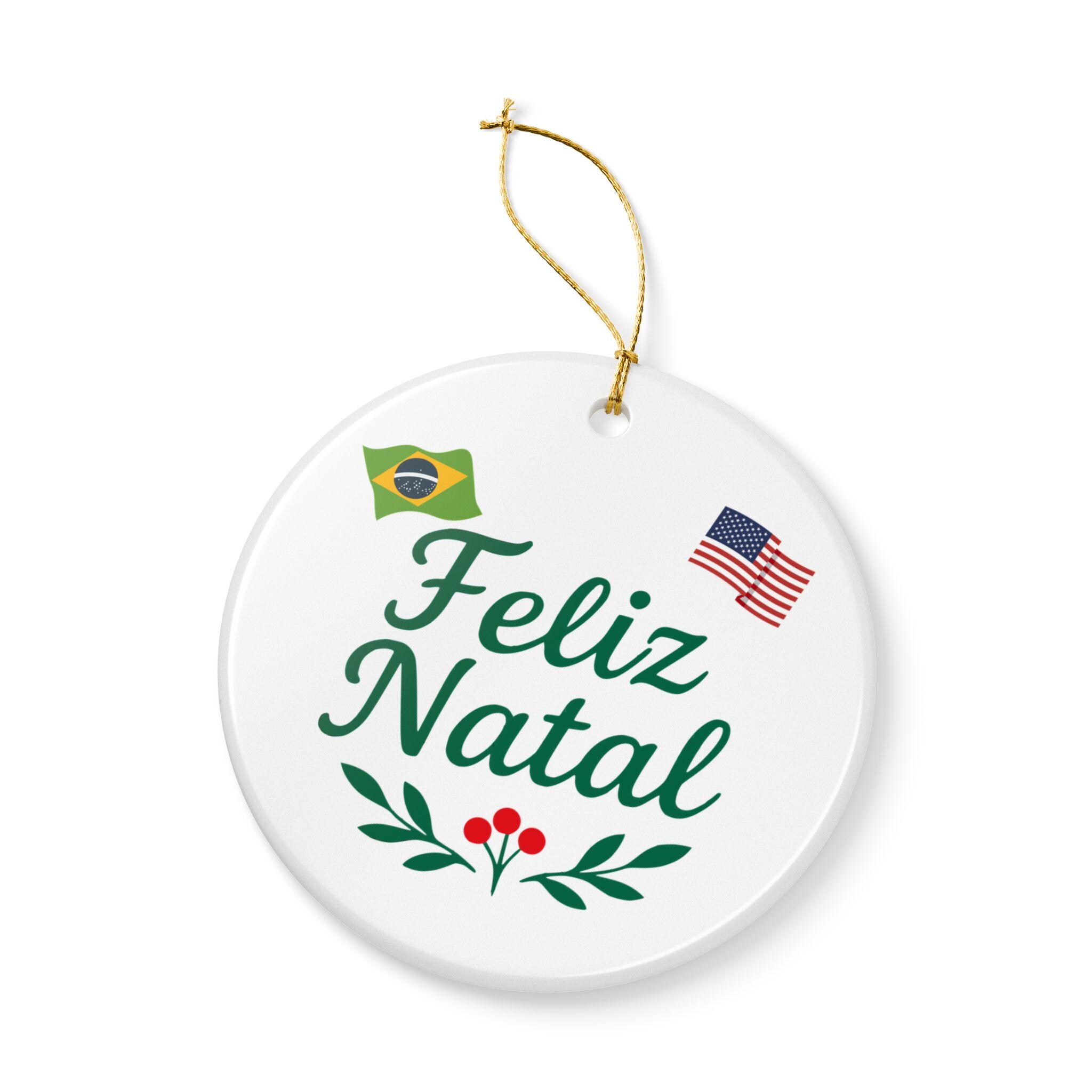 This delicate round ceramic ornament carries a quiet, bilingual wish that bridges two homes. Smooth white ceramic makes the green “Feliz Natal” script feel gentle and honest, while a tiny holly sprig and two miniature flags anchor the design in family and heritage. The gold hanging string catches light like a small celebration; hang it on a tree branch, let it rest in a sunlit window, or nestle it into a wrapped parcel to share a private, cross-cultural moment. Simple lines and soft colors keep the focus on the message — an intimate reminder of togetherness and the small rituals that make the season feel like home.